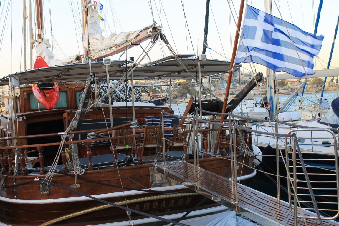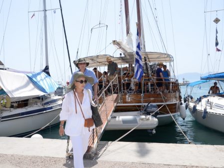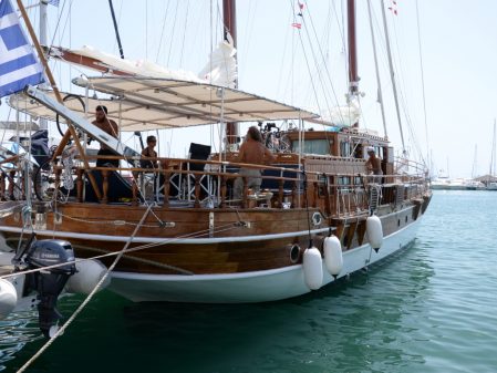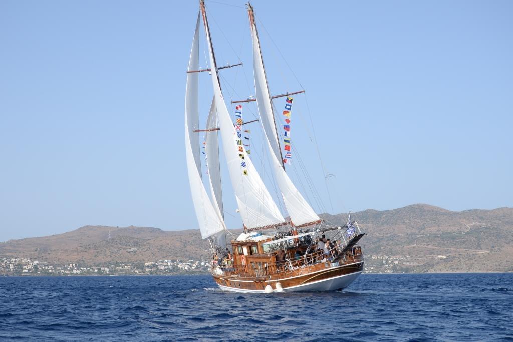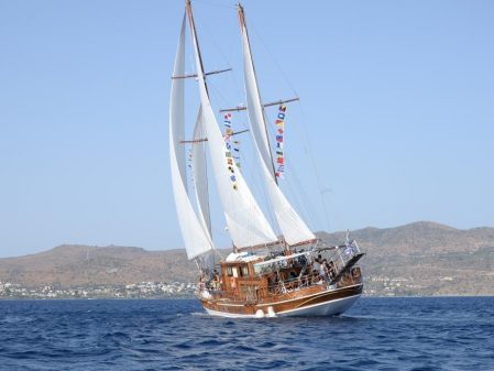 Sail aboard the Apollon, a handcrafted traditional wooden sailing yacht, 25 meters long (or similar yacht). The yacht has seven cabins with en suite bath, a fully equipped galley and indoor salon. Guests have use of the cabins and showers during the cruise. The Apollon’s average speed is ten knots per hour. The yacht has a crew of four with long sea-faring experience.