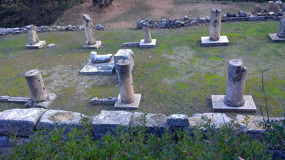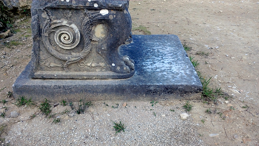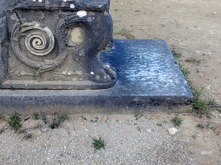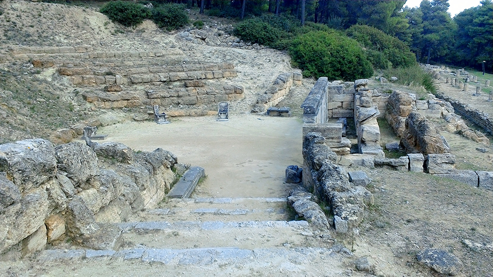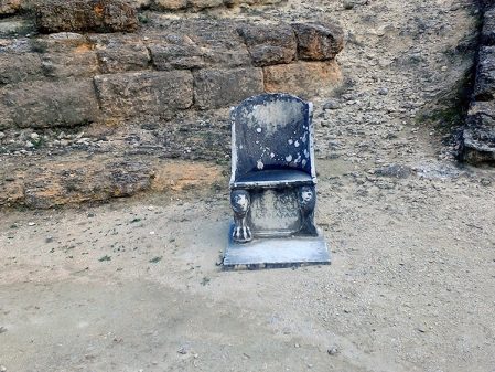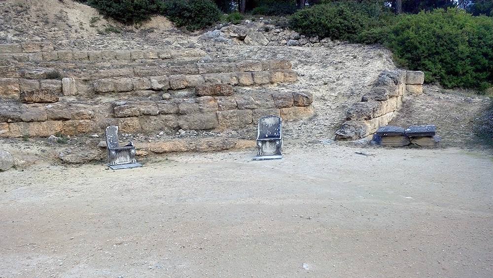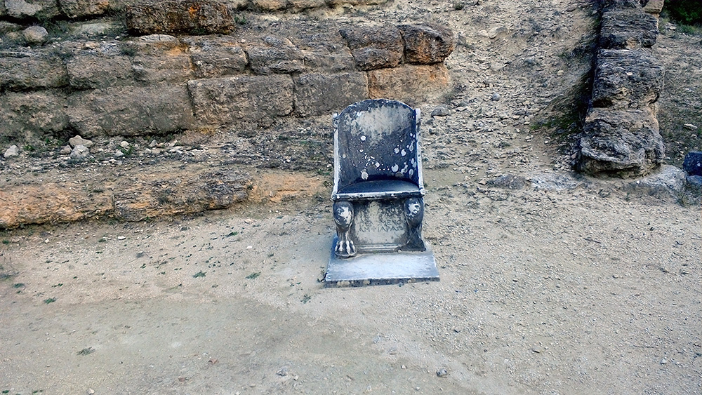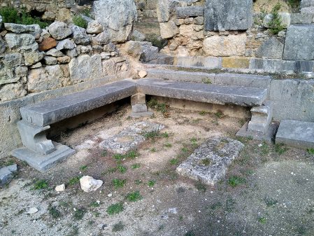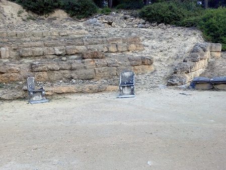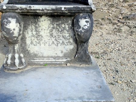 Amphiario’s little theatre is a pleasant delight despite its neglected state. It is hard to imagine the tiers accommodated three hundred spectators. Dignitaries sat in marble seats, five of which remain . The bottom of the chairs depict the familiar Greek spiral next to a lion’s paw. Very classy.