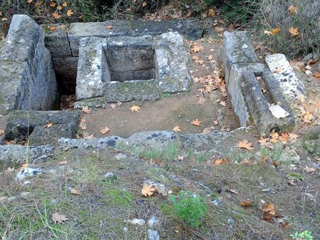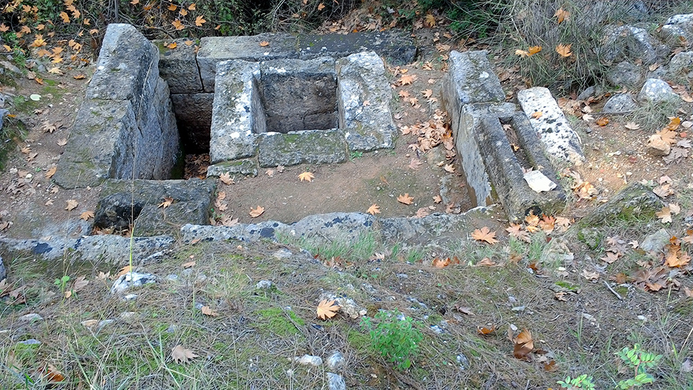 Like all ancient healing centers, Amphiario had a sacred spring. It was pretty dry when we visited in early December. Pausanias wrote that worshipers threw coins into the spring when they were healed of a disease. We crossed the small spring’s moist bed to the other side which was scattered with ruins; only one captured our attention, the klepsydra.
